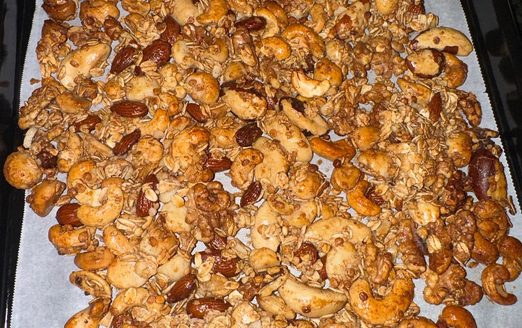 Allow granola to fully cool. Break up by hand, or add to a large sealable bag and break up with a wooden spoon or rolling pin. Enjoy with oatmeal, yogurt, or as its own snack!